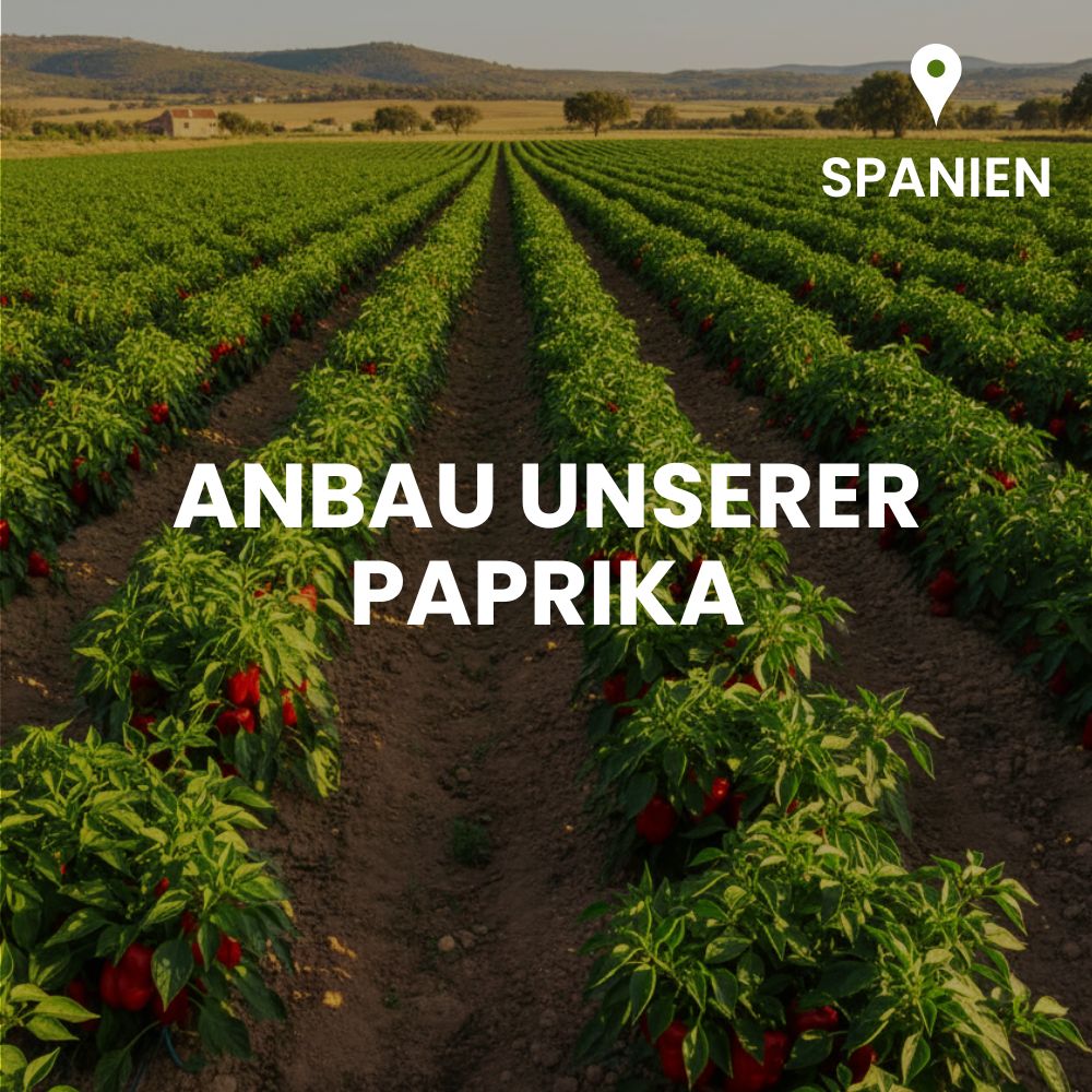 Unser geräuchertes Paprikapulver stammt aus der spanischen Extremadura, einer Region, die für ihren traditionellen Paprikaanbau weltbekannt ist. Dort wachsen die Paprikapflanzen unter idealen Bedingungen: warme Tage, kühle Nächte und fruchtbare Böden, die den Schoten ihre aromatische Tiefe verleihen.
